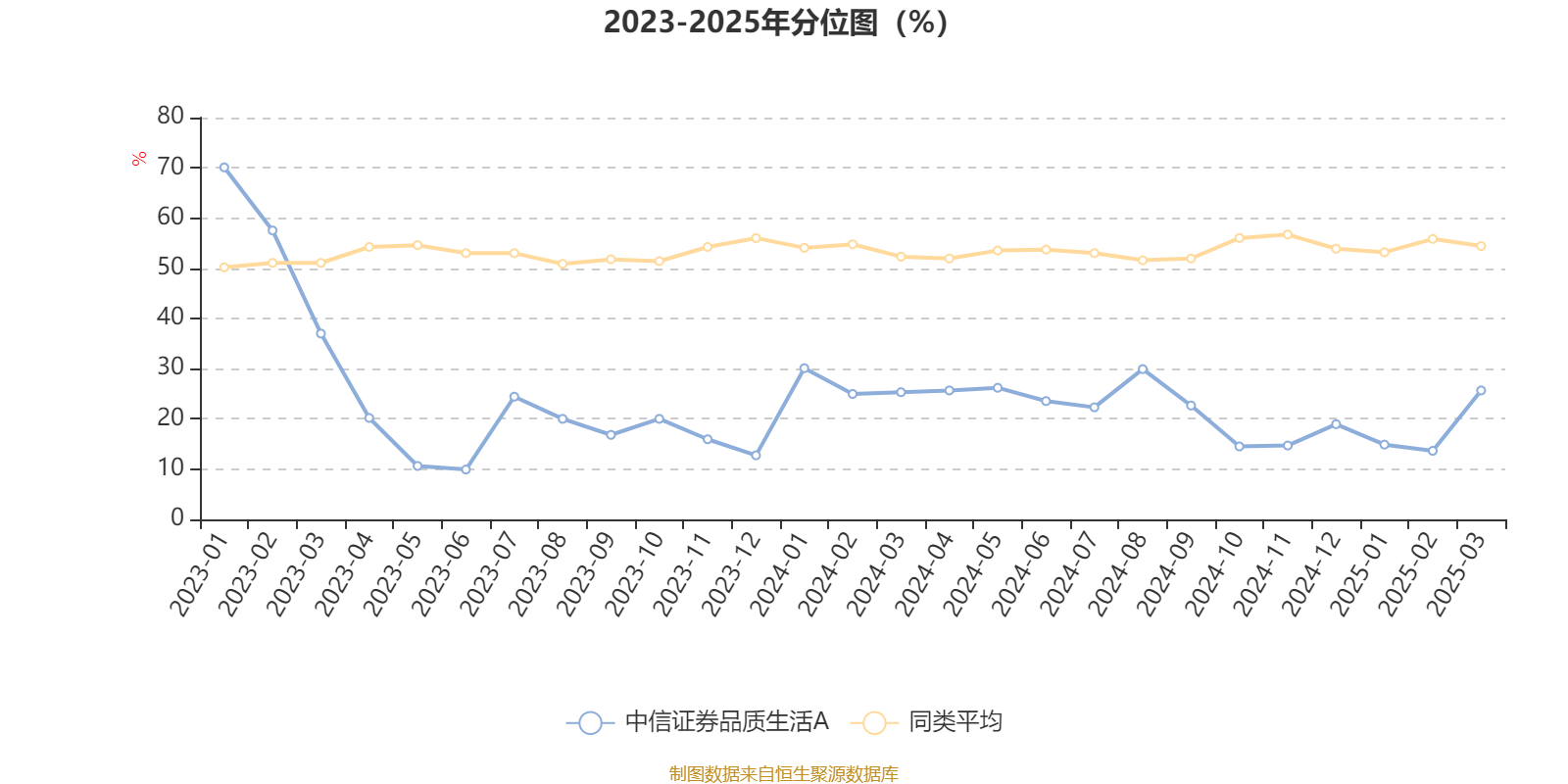 通过所选区间该基金净值增长率分位图,可以观察该基金与同类基金业绩比较情况。图为坐标原点到区间内某时点的净值增长率在同类基金中的分位数。